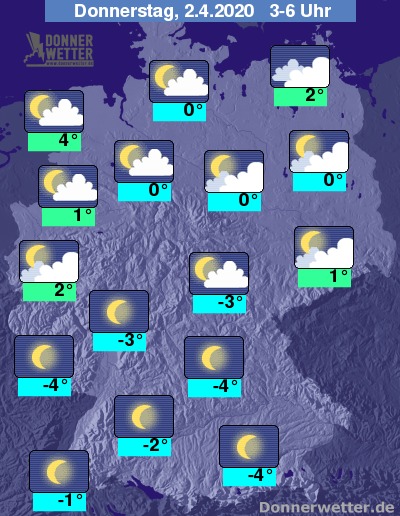 Bis zu den Frühstunden kühlt die Luft in der Nordhälfte auf 0 bis 4 Grad ab, in der Südhälfte gibt es verbreitet Frost zwischen -5 und 0 Grad.