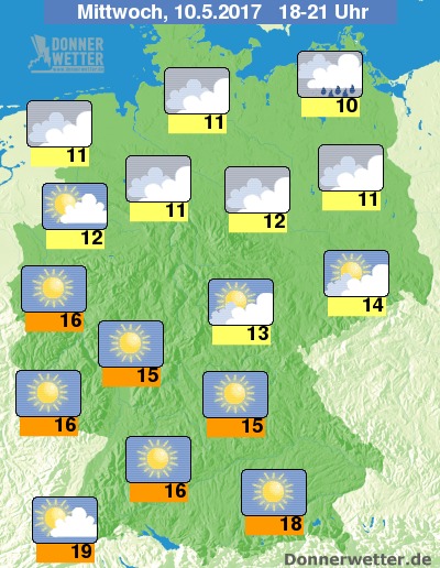 Heute Abend fällt über Vorpommern noch gebiestweise Regen, sonst ist es über dem Norden und Osten zwar noch oft stark, teils aber auch aufgelockert bewölkt, dabei bleibt es trocken. Über der Südwesthälfte des Landes ist es weitgehend sonnig und ebenfalls trocken. Im äußeren Südwesten zieht es sich im Abendverlauf jedoch zu, dazu ist hier und da Regen möglich. Die Temperatur liegt bei kühlen 10 Grad in Stralsund und deutlich milderen 19 Grad im Breisgau.