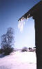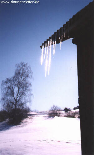 klarer Himmel und Eiszapfen - Eiszapfen entstehen durch die Sonneneinstrahlung. Der Schnee taut auf dem Dach, friert aber "beim Tropfen" wieder in der frostigen Luft und bildet die Zapfen (BB) Baum in Schnee bei Gegenlicht (BB)
