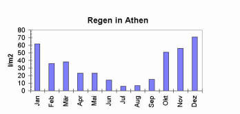 Nur noch weniger als 10 l/m2 Regen fallen im Juli und August in Athen. Bei Höchstwerten bis über 40 Grad sind dies nur die berühmten Tropfen auf den heißen Stein. In Deutschland fallen im Sommer über 60 l/m2 bei wesentlich kühleren Temperaturen und somit wesentlich geringerer Verdunstung.