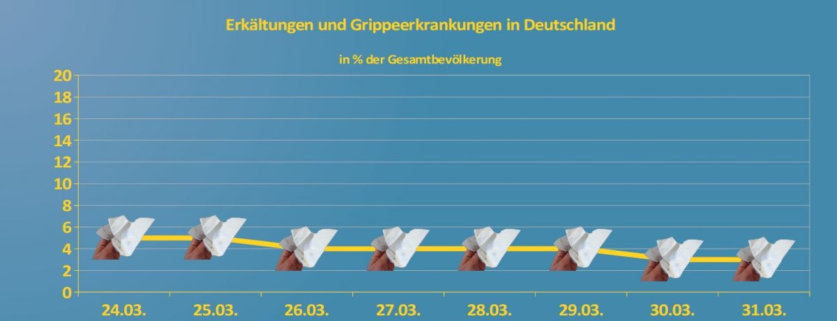 Mit milderen Temperaturen geht die erkältungs- und grippeträchtige Zeit nun ihrem Ende entgegen. Bis zum Ende der Woche liegen die Erkältungszahlen teils unter der Fünf-Prozent-Marke - einem für diese Jahreszeit sogar unterdurchschnittlichen Wert.