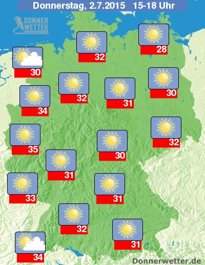 Auch während des sehr starken El Niño 2015/16 erlebte Deutschland einen extrem heißen Sommer 2015 mit mehreren Hitzewellen und Temperaturen von über 35 °C in vielen Regionen (s. Archiv-Wetterkarte vom 02.07.2015)
