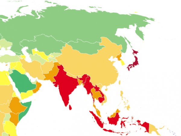 In der tropischen Zone von Südasien, Indonesien und den Phillippinen gibt es Sonne und mächtige Wolken mit teils kräftigen Gewittergüssen, dazu schwüle 27 bis 34 Grad. Zum Teil kann sich in der feuchten Luft Dunst und Nebel bilden.
