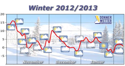 Einen komplett eisigen Winter mit monatelangem Schnee halten wir in diesem Jahr für genauso unwahrscheinlich wie einen sehr milden Winter: Die Temperaturen werden in der Gesamtbilanz wahrscheinlich ziemlich durchschnittlich sein. Allerdings müssen wir uns auf etwa vier kalte Wochen mit Schnee und vereisten Straßen einstellen. Zeitweise kann es auch sehr kalt werden, mit Temperaturen unter -10 tagsüber und -20 Grad C nachts. Zum Ausgleich erwarten wir aber auch vier bis fünf Wochen mit sehr mildem Wetter.