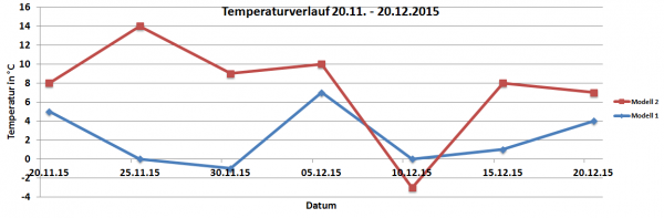 Die nachfolgende Grafik gibt den Temperaturverlauf der beiden von uns genutzten Berechnungsmodelle für den Zeitraum 20.11. bis 20.12.2015 wieder: