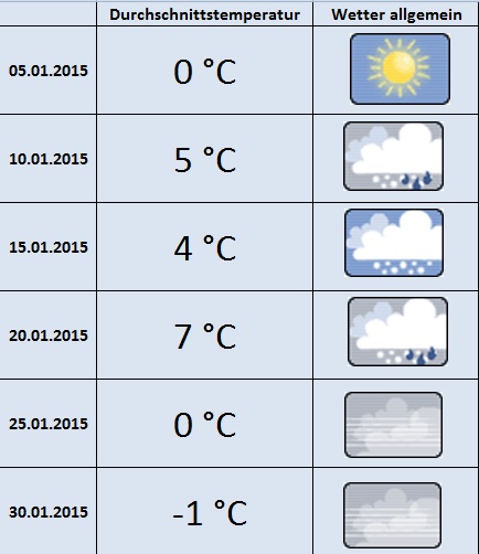 Nach Weihnachten setzt sich die leicht zu milde bis "normale" Tendenz des Winters weiter fort (s. Tabelle).