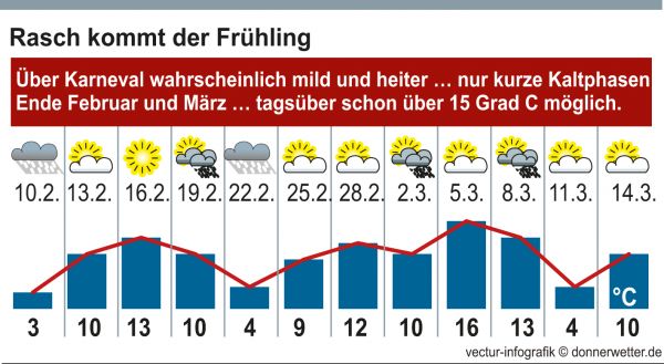 Vor allem trockenes Wetter freut die Karnevalisten in Köln, Mainz, Düsseldorf (und natürlich auch auf den zahlreichen anderen Karnevalsumzügen in Deutschland); nach jetzigem Stand unserer Langfristmodelle kann das fellbesetzte Ganzkörperkostüm in diesem Jahr einem etwas leichteren Outfit Platz machen.