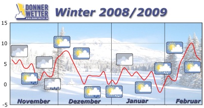 Es ist eine mutige Prognose für die Saison 2008/2009. Es wird ein Winter, der seinen Namen verdient. Wir sind ziemlich sicher, dass dieses mal November/Dezember, aber auch der Januar teilweise deutlich kälter ausfallen, als in den vergangenen Jahren. Die Temperaturen liegen mit einer Wahrscheinlichkeit von 62 % im Dezember zwischen 0 und 3 Grad Celsius und besonders Ost- und Norddeutschland ist es zu kalt. Hier scheint öfters die Sonne.