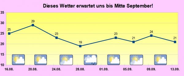 Zu Beginn des Septembers prognostizieren die Modelle dann wieder einen leichten Aufwärtstrend bei Sonnenscheindauer und Temperatur. Damit könnte dann erfolgreich ein versöhnlicher Spätsommer eingeläutet werden.