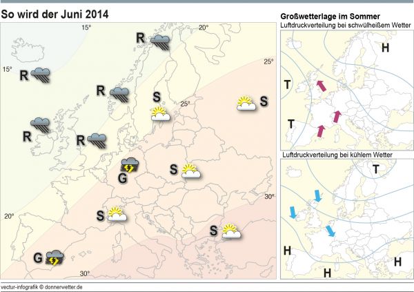 Ein schwülwarmer, teilweise wechselhafter Juni wird im Westen Europas erwartet. In Deutschland dürfte es in diesem Jahr häufig Schauer und Gewitter geben. Zudem ist in der Karte die mittlere Höchsttemperatur eingezeichnet.