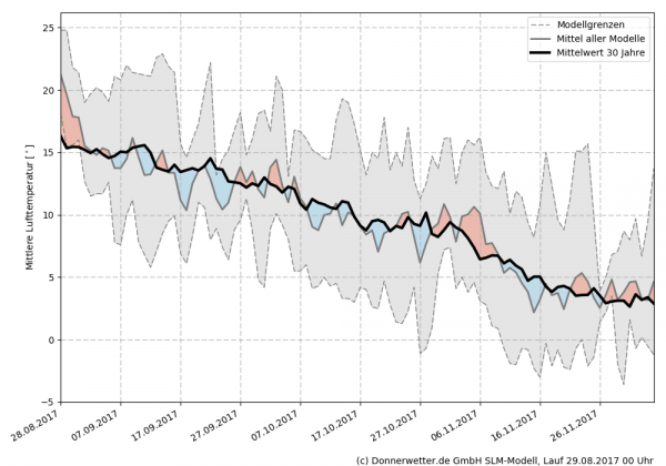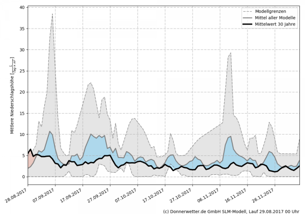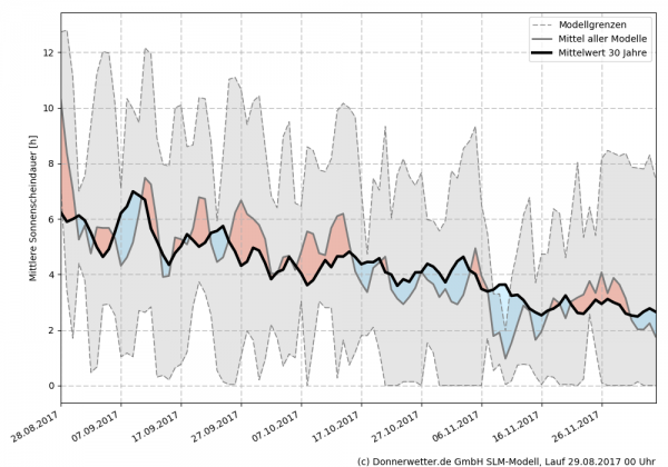Der Altweibersommer hat es nach aktuellen Berechnungen unserer Langfristmodelle im Süden nicht ganz so leicht: Den Temperaturen gelingen in den kommenden Wochen nur selten nennenswerte Sprünge nach oben, zudem gibt es immer wieder nasse Phasen. Allein die zu erwartende Anzahl der Sonnenstunden bis Mitte Oktober macht im Moment ein wenig Hoffnung.