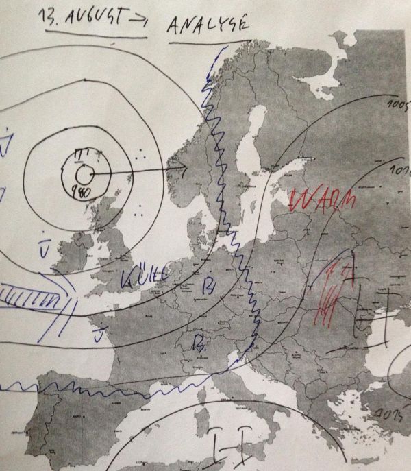 Die Karte mit den Linien gleichen Luftdrucks vom 13.8. zeigt ein ausgeprägtes Tief über Europa. Die warme Luft wird nach Osten verdrängt. Es gibt zwischen den sommerlichen Phasen immer wieder Schauer im Zeitraum bis zum 25.8. in Deutschland.....