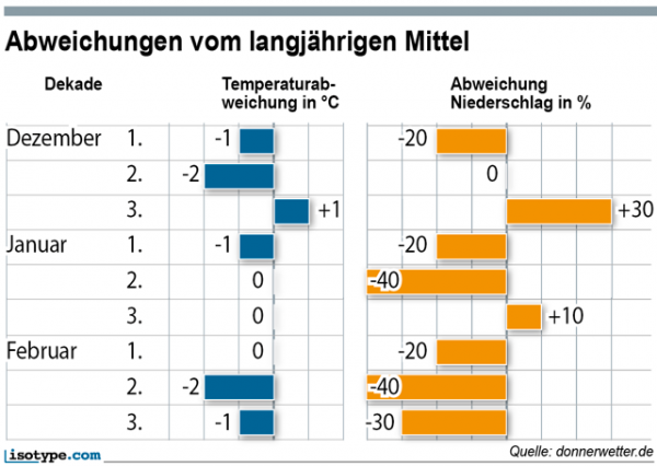 In der nachfolgenden Grafik sehen Sie die aktuell von den Langfristmodellen berechneten Temperatur- und Niederschlagsabweichungen zwischen Dezember 2015 und Februar 2016.
