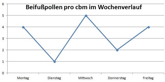 Ab 3 - 4 Beifußpollen pro cbm werden erste nennenswerte allergische Reaktionen beobachtet. Diese Konzentration wird am Montag, Mittwoch und Freitag zeitweise erreicht. Schauer und Gewitter waschen die Luft immer wieder aus. Auch zum kommenden Wochenende ist die Konzentration von Beifußpollen eher schwach: