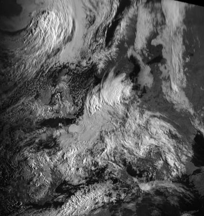 Die hochreichende Bewölkung des Tiefs 'Xena' über Norddeutschland, die auch kräftigen Regen bringt, erstreckt sich vor allem in Richtung Norden nach Südskandinavien. Weite Teile Deutschlands und Nordfrankreichs liegen nur unter einer flacheren, aber dichten Wolkendecke, die sich in der von Norden eingeströmten feucht-kalten Luft gebildet hat. Sie bringt nur wenig Regen.
