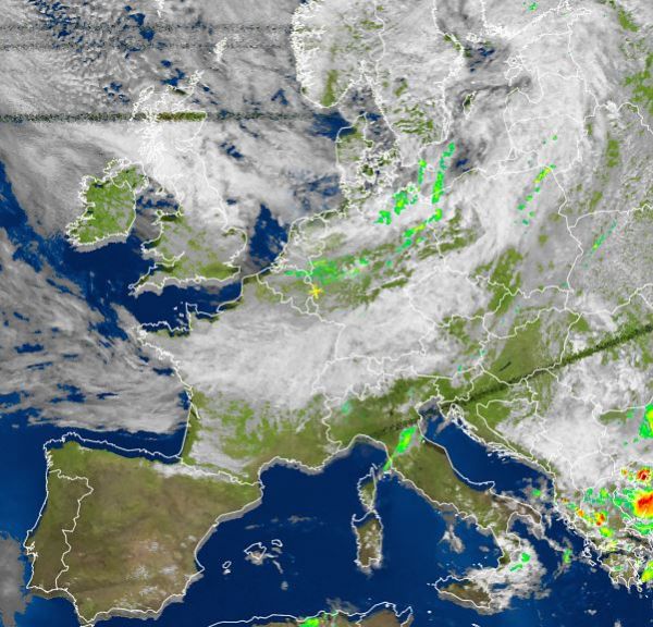 Das Satellitenfoto von heute Nachmittag zeigt viele Wolken von der breiten Mitte bis in den Norden Europas, dabei fällt besonders im Stau der Nordalpen teils langanhaltender und ergiebiger Regen, aber auch sonst ist immer wieder mit einzelnen Schauern zu rechnen. Sehr freundlich mit viel Sonnenschein und trocken präsentiert sich hingegen der Mittelmeerraum. Dabei steigen die Temperaturen tagsüber auf oft über 30 Grad C.