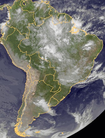 Das heutige Satellitenfoto von Südamerika zeigt besonders über Brasilien vielfach dichte und hochreichende Quellbewölkung, aus der sich gebietsweise teils kräftige Schauer oder Gewitter entwickeln. In den anderen Ländern Südarikas ist es dagegen überwiegend freundlich und es sind nur vereinzelt Schauer oder Gewitter möglich.