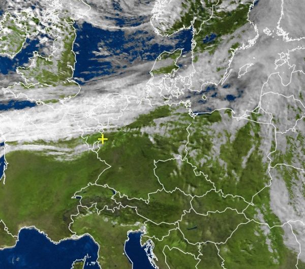 Eine Kaltfront erreicht Deutschland von Norden her. Es wird windig und wechselhaft. Schön zu sehen ist das Wolkenband über der Nordsee. In wenigen Stunden überquert es Deutschland.