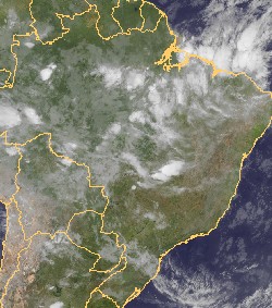 Auf dem heutigen Satellitenbildausschnitt sind über dem Osten von Brasilien hochreichende Quellwolken zu erkennen, die dort für vielfach kräftige Schauer und Gewitter sorgen.