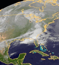 Auf dem Satellitenfoto von heute morgen ist besonders über dem Norden Floridas und dem Süden Georgias dichte Bewölkung zu erkennen. Hier sorgt ein Tief für zeitweise kräftige und ergiebige Niederschläge. Ebenfalls zeitweise regnerisch ist es auch weiter nördlich von Georgia, über Kentucky bis nach Kanada.