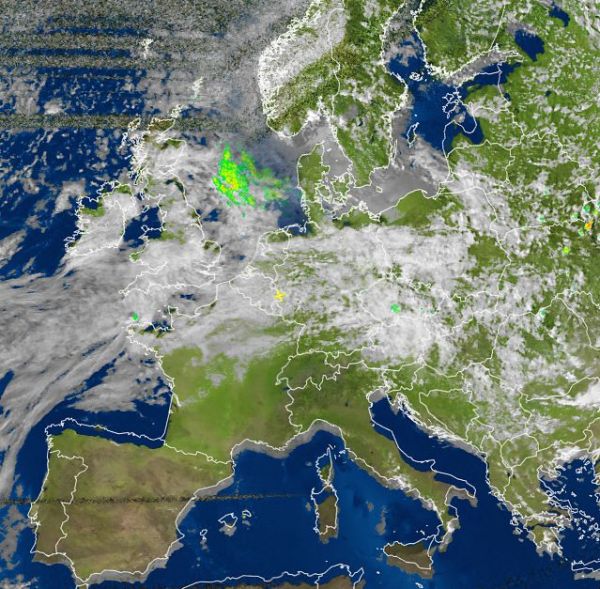 Auf dem Satellitenfoto von heute Nachmittag sind viele Wolken von den Britischen Inseln, über Nordfrankreich, Benelux, Deutschland und weiter nach Osteuropa hinein zu erkennen, hier herrscht insgesamt leicht wechselhaftes Wetter mit gelegentlichen Schauern.