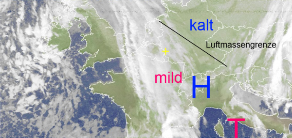 Auf dem Satellitenbild erkennt man die diagonal über Deutschland liegende Luftmassengrenze, die einen kalten Nordosten von einem milden Südwesten trennt. Sie kommt in den nächsten Tagen weiter nach Südwesten voran, so dass es dann auch hier kälter wird.