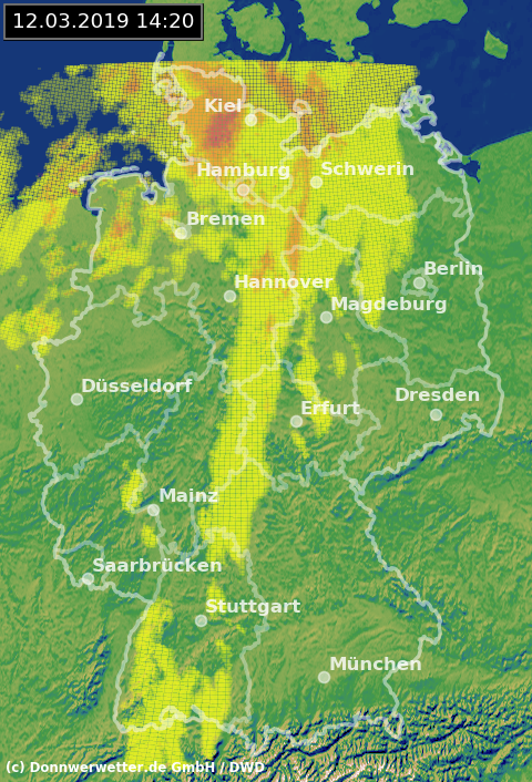 Auf dem Radarbild von 14.20 Uhr erkennt man vor allem im Norden unseres Landes leichte bis mäßige Signale mit Regen. Es handelt sich hierbei um die Warmfront des neuen Sturtiefs, das sich noch im Seegebiet zwischen Island und Schottland befindet. Dieses Tief zieht bis morgen rasch nach Dänemark. Seine Kaltfront überquert uns in der Nacht mit Regen und Wind. Auf den Bergen fällt teilweise auch Schnee. Morgen folgen von Westen weitere zum Teil kräftige Schauer und Graupelgewitter nach. Dazu drohen wieder verbreitet schwere Sturm- vereinzelt sogar Orkanböen.
