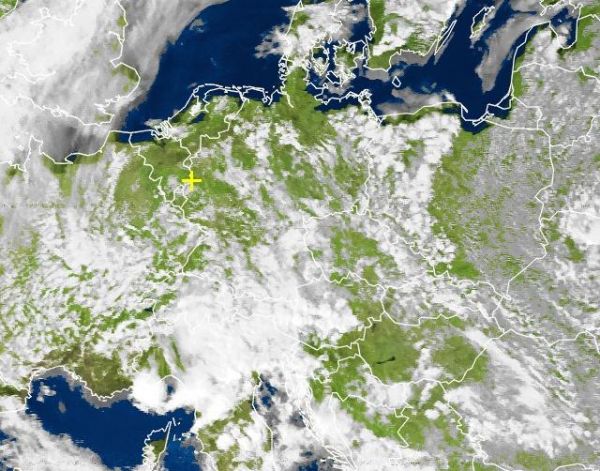 Nur noch am Alpenrand hängen dichte Wolken mit etwas Regen. Die Wetterbesserung ist in ganz Deutschland spürbar. Morgen erreicht uns von Westen her nochmals ein Tief mit etwas Regen (Wolken über England schon zu sehen).