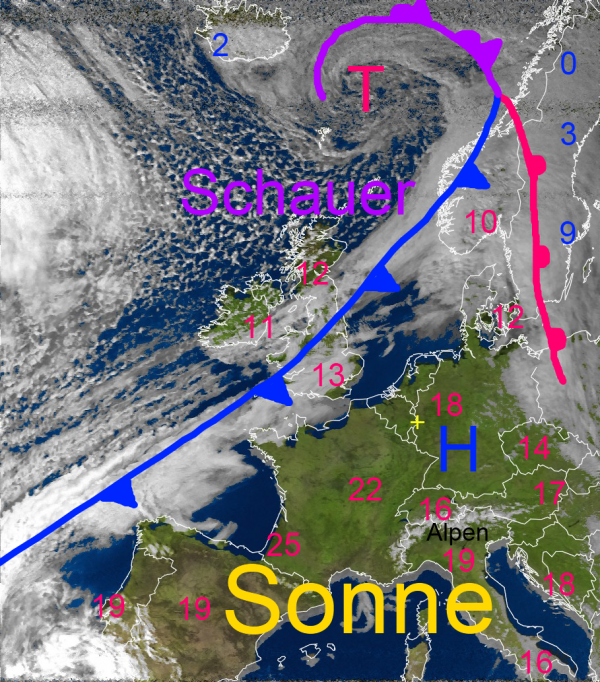Auf dem heutigen Satellitenbild erkennt man schön das frühlingshafte Mittel- und Südeuropa, aber auch das Sturmtief über dem Nordmeer mit seinen Fronten. Die Kaltfront überquert uns morgen mit etwas Regen und Schauern. Dahinter strömt wieder deutlich kühlere Luft nach Deutschland und beendet vorläufig die Frühlingsphase.