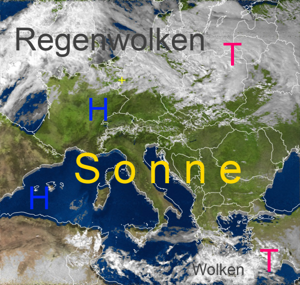 Auch über weiten Teilen Südeuropas ist es wolkenlos oder nur leicht bewölkt. Lediglich über der Ägäis hält sich hartnäckig ein kleines Tief mit vielen Wolken und örtlichen Regengüssen.