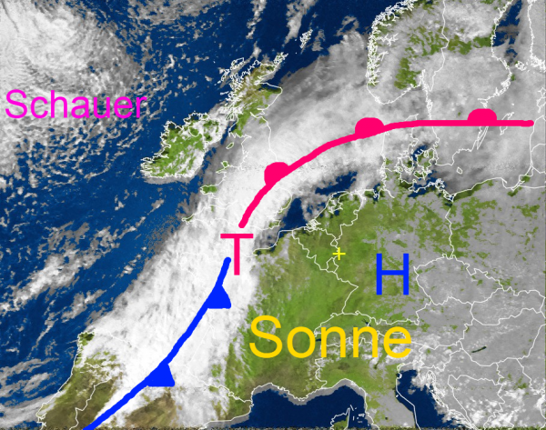 Der Himmel über Deutschland präsentiert sich meist nur leicht bewölkt. Hinter der über der Nordsee und Südschweden liegenden Warmfront konnte sich die Luft im Zusammenspiel mit reichlich Sonnenschein auf 25 bis 30 Grad erwärmen.