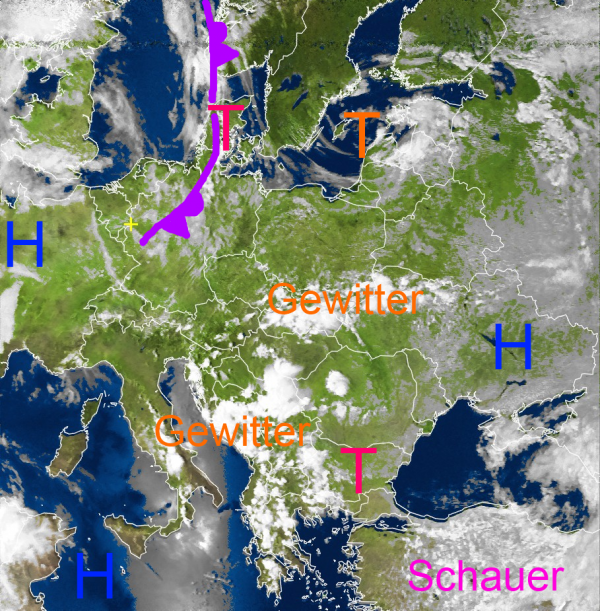 Eine über Deutschland angelangte Okklusionsfront löst vor allem in Teilen Norddeutschlands und Bayerns einige teils gewittrige Regengüsse aus. Sonst überwiegt aber freundliches Wetter mit Sonnenschein und frühsommerlichen Temperaturen.