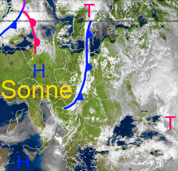 Über Mitteleuropa scheint häufig die Sonne. Im Nordwesten macht sich die Warmfront eines Atlantiktiefs mit dichteren Wolken bemerkbar. Hinter ihr strömt morgen von Südwesteuropa vorübergehend sehr warme Luft nach Deutschland. Die Temperaturen können vor allem am Oberrhein die 30 Grad - Marke überschreiten.