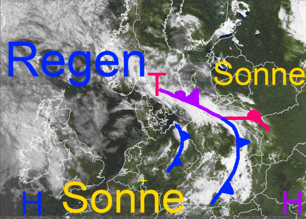 Viele Regenwolken findet man auch über Nordwesteuropa auf dem Weg nach Skandinavien.