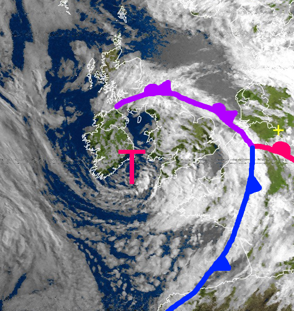Auf dem Satellitenbild von heute morgen gut zu erkennen das Tief bei Irland, welches morgen und in den kommenden Tagen für eine Wetteränderung in Deutschland sorgen wird. Es wandert mit seinem Kern zur Nordsee und überquert uns mit seiner Störungsfront. Dabei muss verbreitet mit kräftigen teils gewittrigen Regenfällen gerechnet werden. Örtlich drohen auch wieder Unwetter mit Überschwemmungen. Außerdem wird die sehr warme und schwüle Mittelmeerluft durch kühlere Luft vom Atlantik ersetzt.
