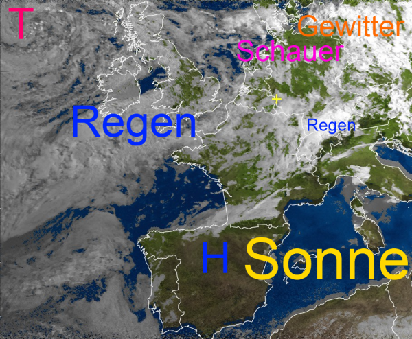 Kompakte Regenwolken des großen Tiefs über dem Atlantik ziehen über die Britischen-Inseln hinweg. Einige Regenwolken halten sich auch über dem Alpenvorland. Schauer und Gewitter wandern über Norddeutschland. Sonst hat sich eine recht freundliche Mischung aus Sonne und Wolken eingestellt.