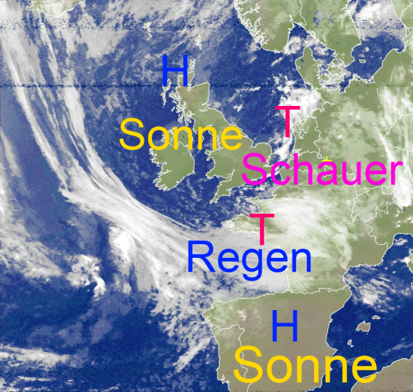 Zu beachten sind die kompakten Schauerwolken über der Deutschen Bucht und über dem englischen Kanal. Sie konnten deswegen entstehen, weil sich über dem noch warmen Wasser deutlich kältere Polarluft befindet und es deswegen vertikal zu großen Temperaturunterschieden kommt.