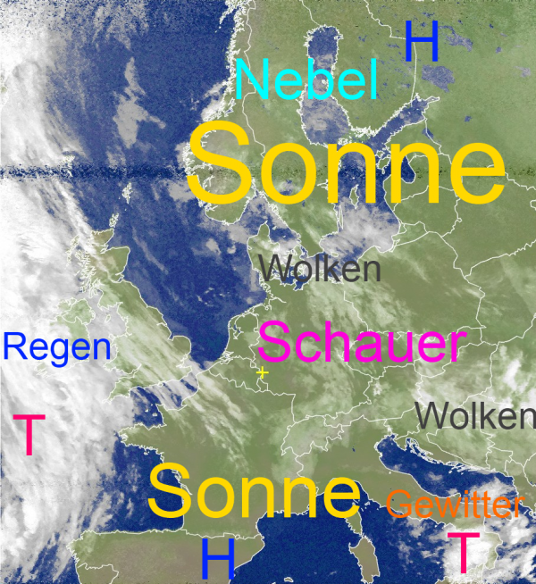 Geringe Luftdruckunterschiede sorgen über Mitteleuropa für wenig Luftbewegung. Nach Auflösung von Frühnebelfeldern scheint teilweise die Sonne, teilweise halten sich aber auch dichtere Wolken. Örtlich können sich Schauer und einzelne Gewitter entwickeln.