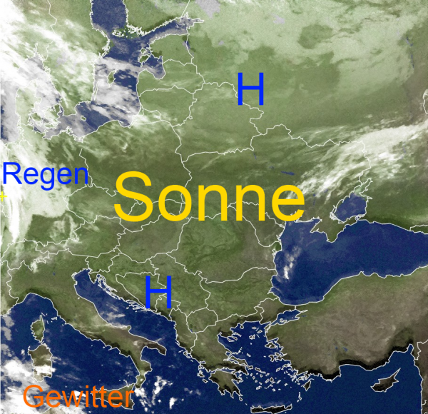 Während bei uns schon einige Regenwolken aufgezogen sind, herrscht über weiten Teilen des Kontinentes noch freundliches Wetter mit viel Sonnenschein. Rund ums Mittelmeer findet man dabei auch noch badetaugliche Temperaturen von 25 bis 30 Grad. Weiter nach Norden wird es jedoch spürbar kühler.
