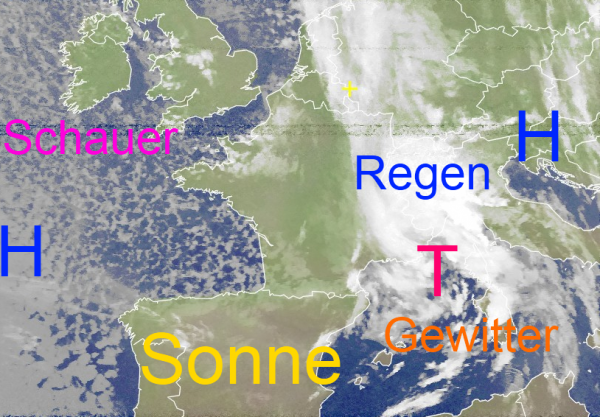 In Folge des polaren Kaltluftvorstoßes auf der Rückseite der über Mitteleuropa liegenden Wolkenzone hat sich über dem nördlichen Mittelmeer ein Tief entwickelt. Dieses Tief sorgt heute und auch zu Wochenbeginn durch Südstau für kräftige Niederschläge über den Alpen und Oberitalien. In höheren Lagen der Berge wird es weiß.