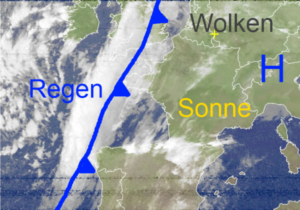 Über Westeuropa liegt eine Kaltfront bereit, die uns in der Nacht mit neuen Regenwolken überqueren wird. Hinter der Front strömt wieder etwas kältere Luft nach Mitteleuropa, so dass es morgen in den Bergen teilweise wieder schneien kann.
