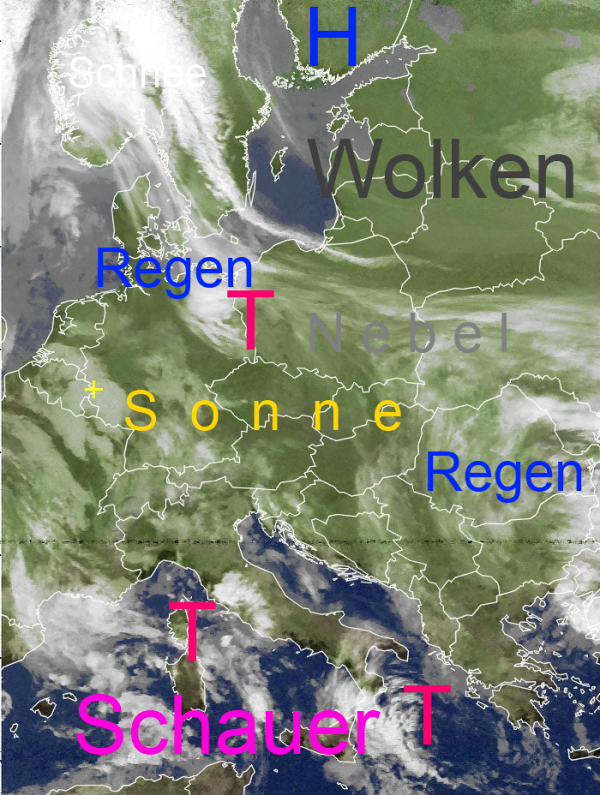 Das Regengebiet eines Tiefs im Bereich der Oder zieht von Osten über Norddeutschland hinweg. Sonst gibt es über weiten Teilen Europas eine Mischung aus Wolken, Nebel und zwischendurch auch Sonne. Tiefdruckgebiete über Südeuropa sorgen für Schauerwetter im Mittelmeerraum.