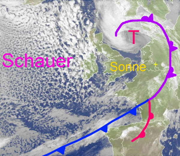 Die Mischfront eines Nordseetiefs überquert Deutschland mit Regen- und Schneewolken. Hinter der Front erkennt man über den Britischen-Inseln, Belgien und Nordfrankreich auch sonnige Lücken.