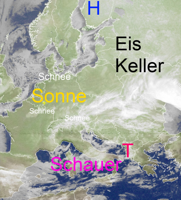 Mit nordöstlicher bis östlicher Strömung gelangt weiterhin kalte Kontinentalluft aus dem Eiskeller Russlands nach Mitteleuropa. Dadurch entstehen über dem vergleichweise erwärmten Wasser der Ostsee neue mächtige Schneeschauerwollken, die vor allem im Küstenbereich von Norddeutschland wieder für größere Neuschneemengen sorgen.