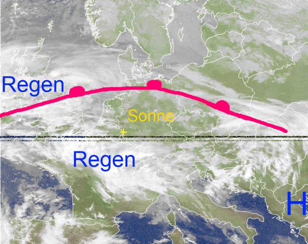 Hinter der über Norddeutschland liegenden Warmfront strömt sehr milde Luft aus Südwesteuropa nach Deutschland. Der Wettercharakter gestaltet sich dabei jedoch ziemlich durchwachsen. Neben einigen Aufheiterungen muss also immer mit Regen oder Schauern gerechnet werden.