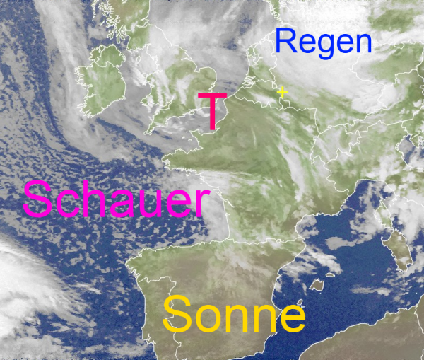 Über dem Nordosten Deutschlands erkennt man ein fettes Regengebiet. Das Tief über dem Ärmelkanal schaufelt von Frankreich und Belgien weitere Regen- und Schauerwolken nach Mitteleuropa. Es zieht bis morgen zur Ostsee und zapft wieder kältere Luft aus Skandinavien an.