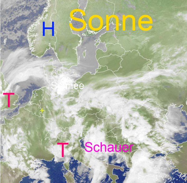 Ein Tief über England, sowie über dem Golf von Genuar sorgen in Europa für reichlich Wolken mit Regen oder Schauern. In Teilen Norddeutschlands fällt sogar Schnee. Zwischen den Wolken findet man jedoch auch größere freundliche Gebiete.
