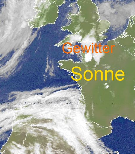 Noch scheint in Deutschland vielfach die Sonne. Aber über der Normandie und dem englischen Kanal haben sich bereits mächtige Schauer- und Gewitterwolken gebildet, die am Nachmittag in den Westen unseres Landes ziehen können. Am Abend erreichen örtliche Gewitterzellen auch die mittleren Landesteile. Außerdem entstehen regional einzelne Wärmegewitter.