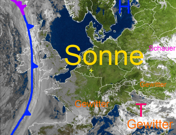 Über weiten Teilen Mitteleuropas herrsch weiterhin prächtiges Frühsommerwetter mit blauem Himmel und viel Sonnenschein. Morgen allerdings bilden sich auch bei uns erste Schauer- und Gewitterzellen. Zu Christi - Himmelfahrt leitet die Kaltfront über Westeuropa eine Wetterverschlechterung und Abkühlung ein. Schauer und Gewitter treten dann verbreiteter auf und können auch sehr kräftig ausfallen.