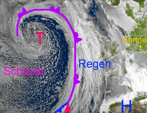 Über dem Atlantik hat sich ein klassischer Wolkenwirbel gebildet. In Verbindung mit der Mischfront werden morgen in Deutschland teils kräftige Schauer und Gewitter ausgelöst, die zu kleinräumigen Überschwemmungen führen können. Im Anschluss daran kühlt sich die Luft spürbar ab.